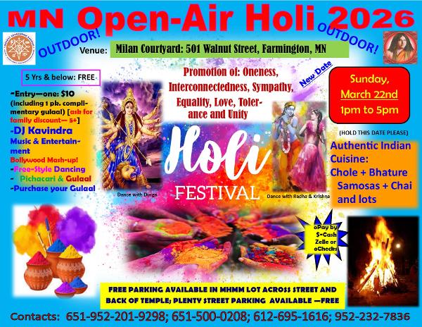 You are cordially invited to participate in MN Open-Air (outdoor) celebrations in Milan Courtyard on Sunday March 22nd, 1pm to 5pm. Also celebrating Chaitra Navratri on this day welcoming the divine Mother of the Universe with dances and colors. Please wear your dancing shoes and come dance to Bollywood beats provided by DJ Kavindra. Gulaal in many bright colors will be available for purchase at the event grounds (ask about discounts available). Purchase your entry ticket at the entrance. Discounts for family of 5 and more.